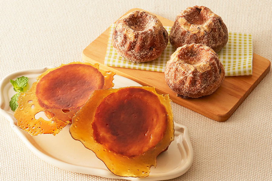 『フランスフェア』に登場する「ドミニク・ドゥーセの店」の焼きたてフラン(ホール1801円、1/4 カット501円)、焼きたてクロワッサン(1個324円)