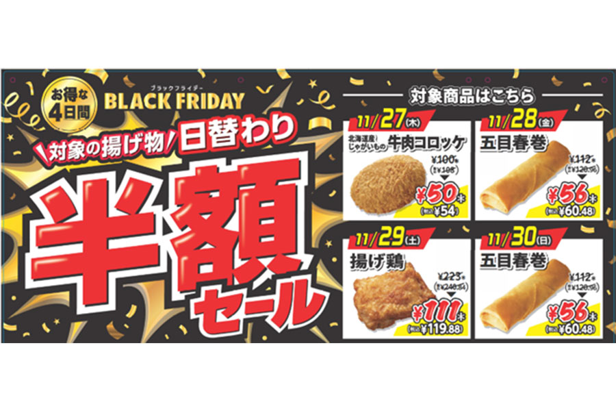 そんなブラックフライデーを、同コンビ二では11月27日〜30日の4日間限定で実施。初日27日は定番の「北海道産じゃがいもの牛肉コロッケ」が半額の54円、そのほか「五目春巻」が60円、「揚げ鶏」が119円など、日替わりでスタンバイ(他のキャンペーンとの併用は不可)。標準価格より最大112円引きとなる。