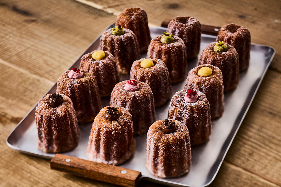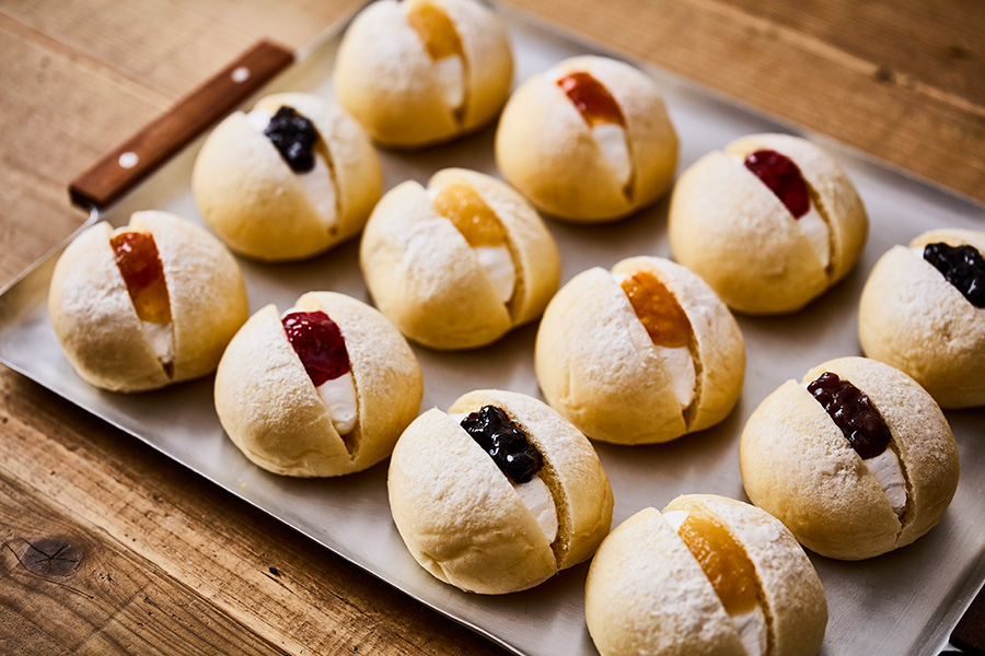 「アンジュのジャムパン」は、関西を拠点に手作りジャムを展開する「メルカートピッコロ」の国産ジャムを使用し、トウモロコシやカシス、大阪ならではの「ミックスジュースのような」など、5種類のフレーバーをスタンバイ。また「ブリオッシュカヌレドーナツ」はカスタード・チョコ・いちごの3種類が並ぶ。