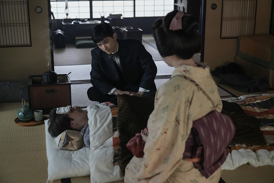• 『ばけばけ』第47回より。風邪を引いたヘブンを看病する英語教師・錦織たち。写真左から、ヘブン(トミー・バストウ)、英語教師・錦織(吉沢亮)、トキ(髙石あかり)(C)NHK