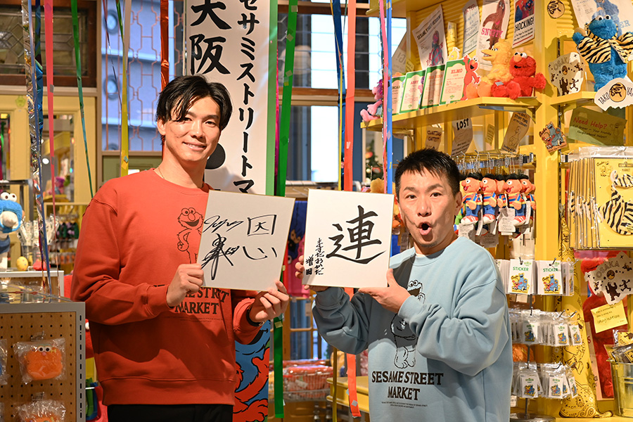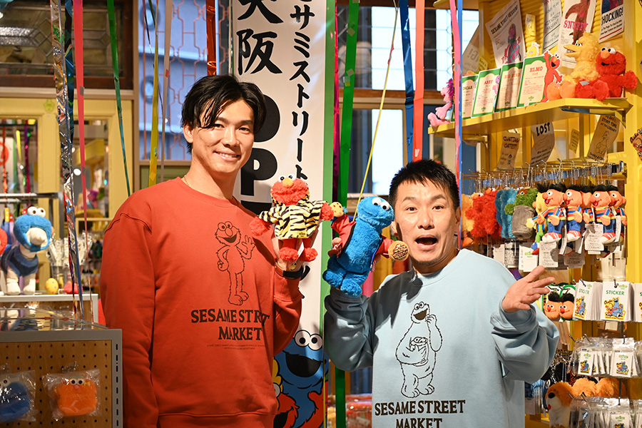 • 左から、「セサミストリートマーケット」のオープニングイベントに登場した湯浅京己投手とますだおかだ・増田。お気に入りグッズを持って撮影(12月3日・阪神梅田本店)