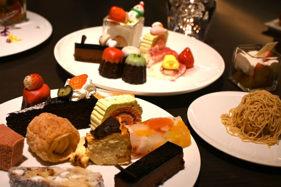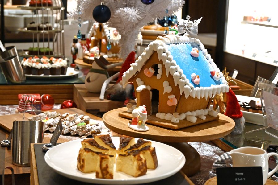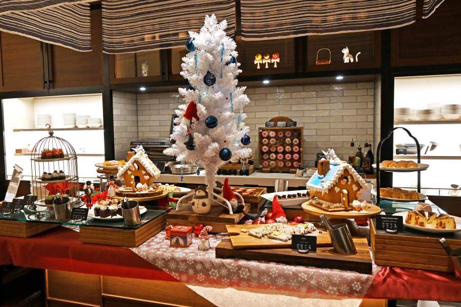 • お菓子の家やツリーで飾られたビュッフェ台に、各国を代表する伝統菓子など、さまざまなスイーツが「ダブルツリー byヒルトン大阪城」
