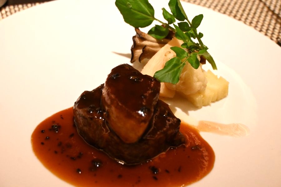 • スペシャルディッシュ「国産牛ロースのグリルとフォアグラのソテー 季節の野菜添え トリュフソース」