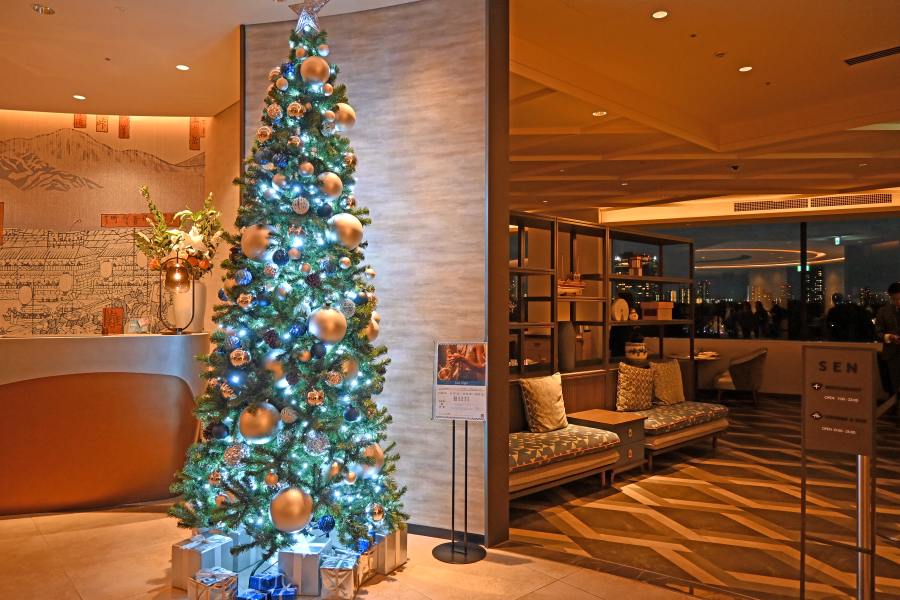 • 館内は「リバーサイドクリスマス」をテーマに、ブルーとシルバーのクリスマス装飾が。フロント階には大きなツリーも登場