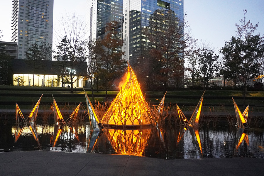 そのほかにも、水盤には高さ4mの篝火型シグネチャーモニュメント「THE KAGARIBI」が設置され、揺らめく炎の光と焚き火を囲んでいるかのような音楽で、視覚的にも温かさを感じられるアート展示に。点灯時間は17時〜24時まで、15分毎にミストショーの演出もあり幻想的な光景を見ることができる。