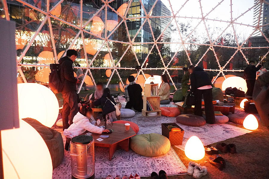 芝生広場に登場した巨大な透明のドームテント「THE DOME」は夜の雰囲気も素敵