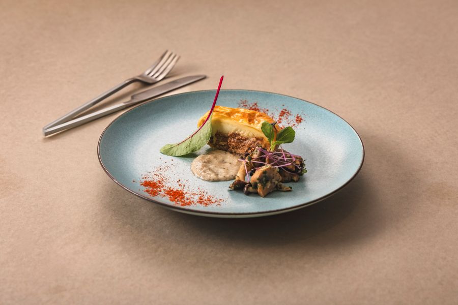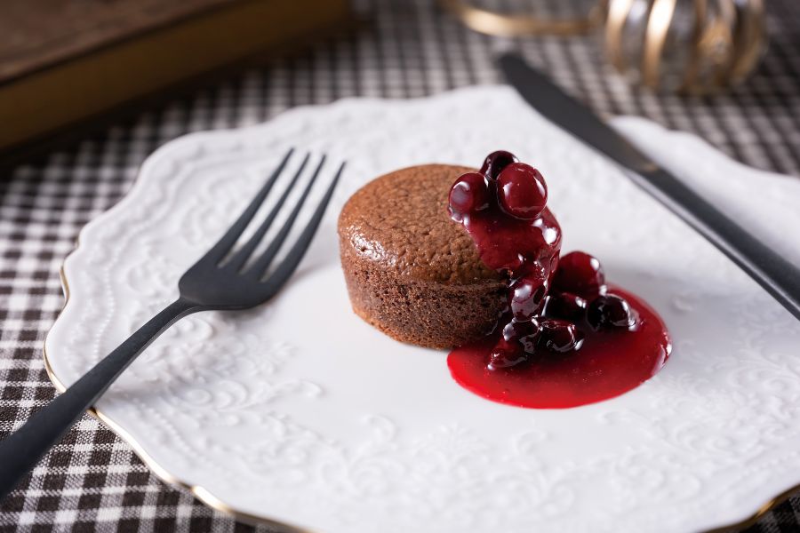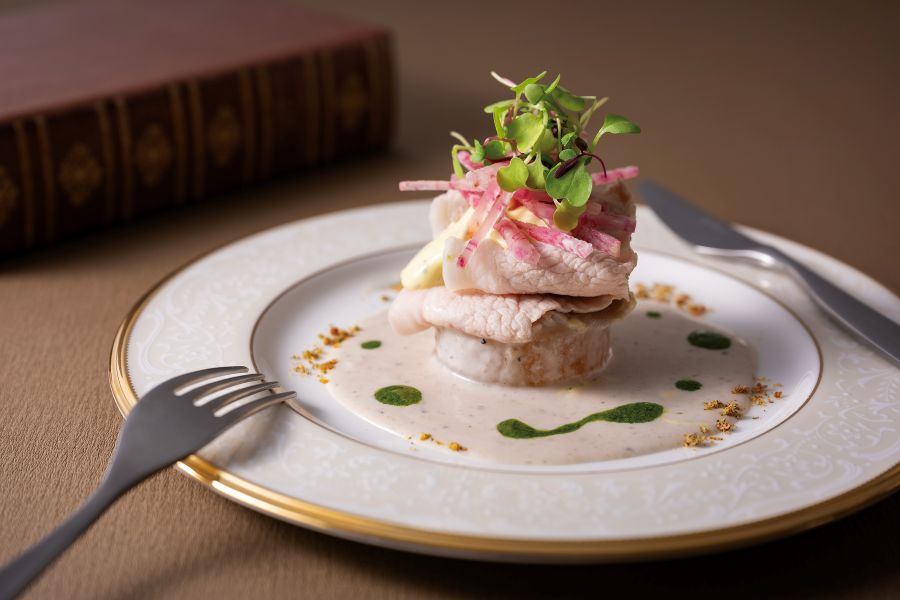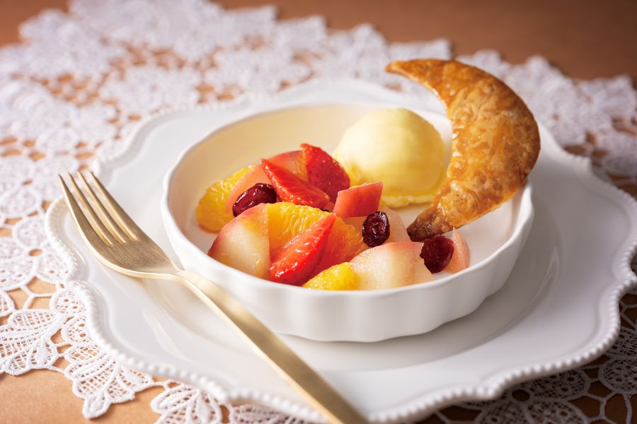 トリュフ香るソースで味わう牛肉のロースト(ディナー限定)や魚介類のクレープ包み焼きに、スイーツには「クレーム・ブリュレ」や「ガトーショコラ」などが登場する。