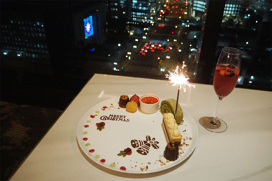 食後のお楽しみデザートは、好きな量をすくって盛り付ける「スコップケーキ」(ディナー限定)や「エクレア」「プチシュー」、季節のタルトなどが勢揃い。さらに、オプションの「天空のアニバーサリープラン」(ランチ・8750円~、ディナー・1万3500円)なら、ビュッフェ&ドリンク飲み放題に加えて、記念日を盛り上げるミニ花火付きのデザートプレートが提供され、12月25日まではクリスマスメッセージ付き仕様に(前日までに要予約)。