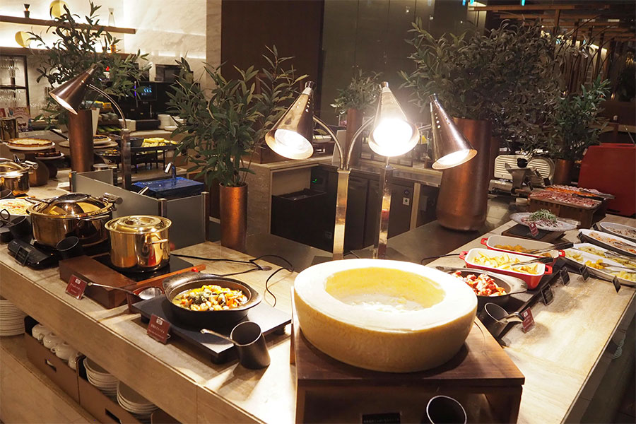オフィス街に合わせた大人が楽しめる「本格イタリアン」ビュッフェは、今春から季節の食材にスポットをあて、12月からは冬の味覚が主役。ディナーには「牡蠣のアヒージョ」「寒ブリのカルパッチョ」など、ワインとのマリアージュを意識した旬メニューが揃い、特に12月限定の燻製が香ばしい「スモークチキン」はホリデーシーズンにぴったりな一品。