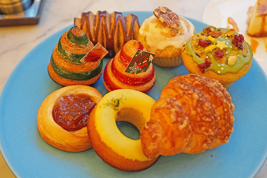 食べ放題のパンは、山盛りに入った箱で各テーブルへ届けられる。他の「パン食べ放題」と一線を画すのは、見た目の可愛さだ。現在は、クリスマスにちなんだツリー型のクロワッサンや、リースのように飾られたマフィンなど、16種類ほどが並ぶ。