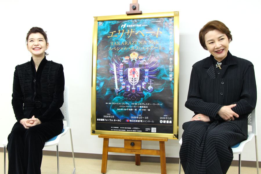 初演に続く星組公演(1996年)で主役のトートを演じた、元星組トップスターの麻路さき。その星組新人公演で主演し、2005年月組公演のトート役で宝塚を卒業した元月組トップスターの彩輝なお。縁の深いふたりが、大阪で取材会を開き、当時のエピソードなどを語った。