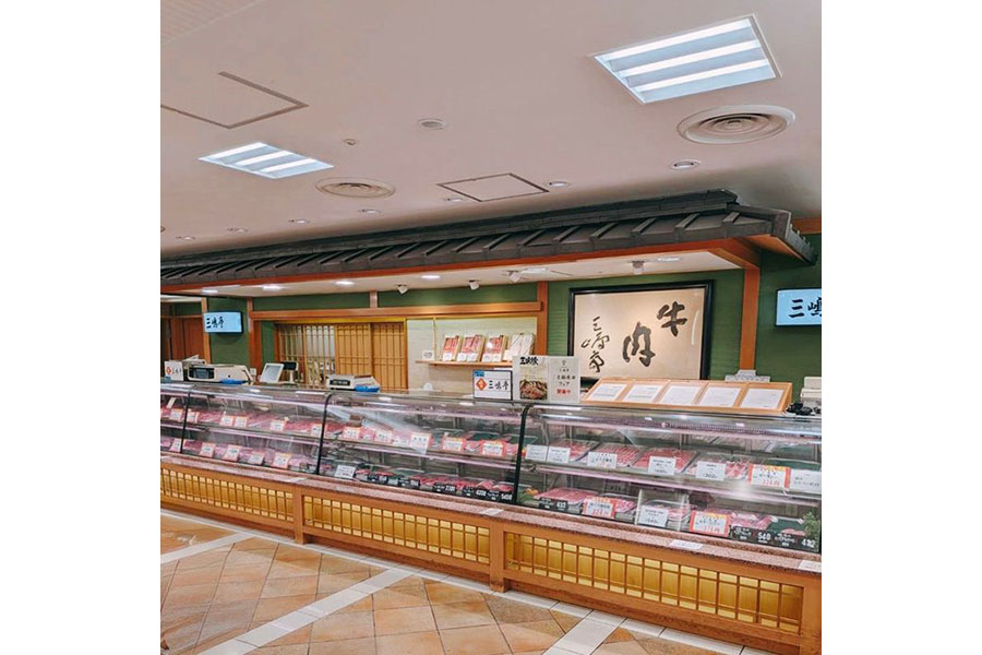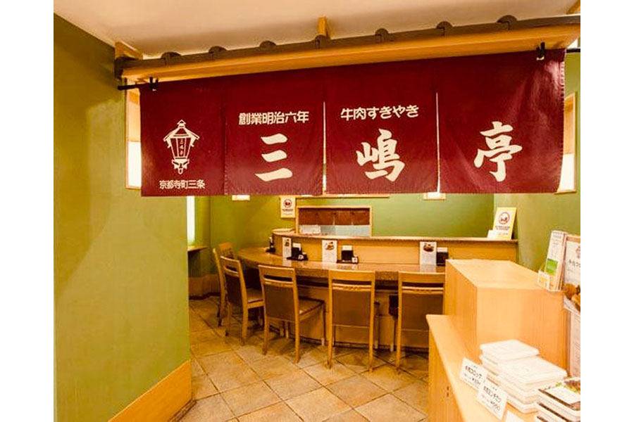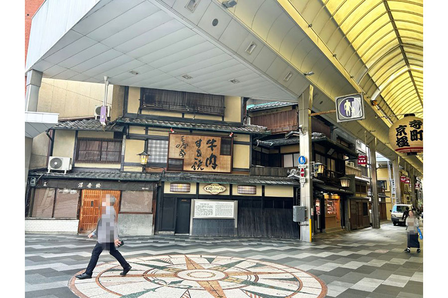 京都・三条通の「寺町京祇園商店街」に面して建つ趣のある木造3階建てが、三嶋亭本店です。現在は商店街のアーケードがあり、建物の全景を見ることはできませんが、創業時の建物を今も使用しています。1階は、右側がすき焼き肉などを販売する精肉売り場、左側はすき焼きなどを提供する飲食店の入り口になっています。