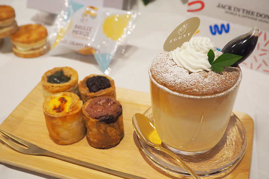 岡山県赤磐市産の平飼い卵を使ったスイーツが揃う「エグジー」には、「カステラぷりん」(702円)など、老若男女に好まれる品々がラインアップ。看板メニューは、フランスの伝統菓子「フラン」で、パイ生地にこだわりカスタードを流し込み、じっくりと焼き上げた一品。ひとくちサイズなのも◎。