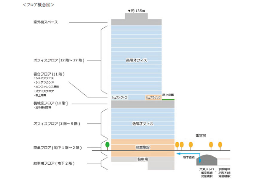 2026年に開業予定の「淀屋橋ゲートタワー」、地上29階・地下2階、高さ約135m