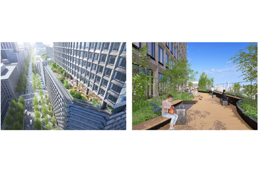 建物外観には、重厚な門構えを想起させる格子状の意匠が施されたデザインに。地下1階は駅と直結し、施設は地下1階〜地上2階に商業フロア、3階以上をオフィスとし、11階は一般利用も可能な屋上庭園を含む複合フロアとなる予定。