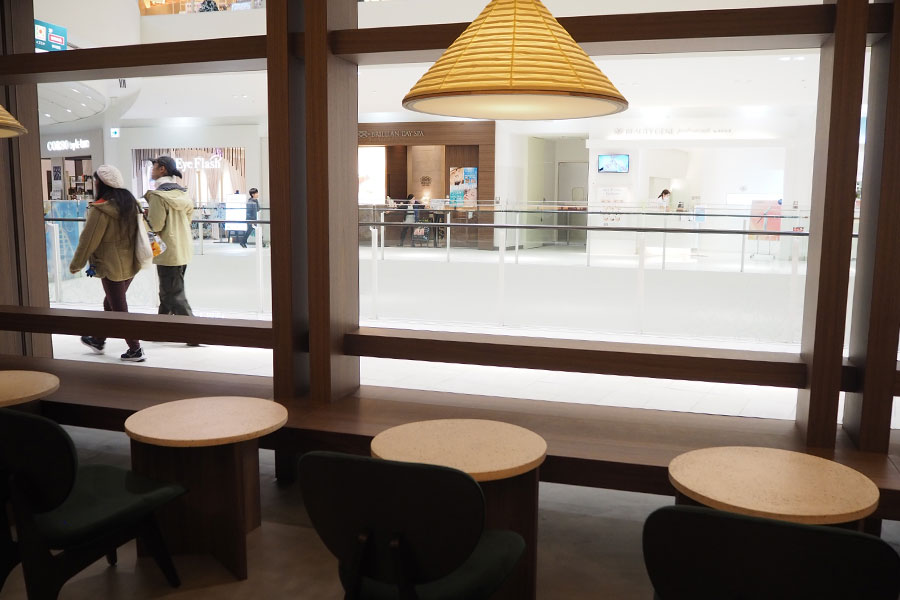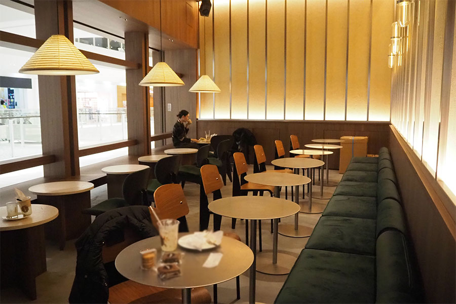 店内は旅館のような和テイストの板張りが目を引き、通路側との仕切りがない部分が多い縁側風シートも。シックな緑色の椅子・ソファは幅広い年齢層に親しまれる「純喫茶」をイメージ。さらに、間接照明のような明るさにすることで、商業施設の吹き抜けに面した明るい通路に対し、周囲とは反転した木陰に佇むような奥行きのある空間をめざす。