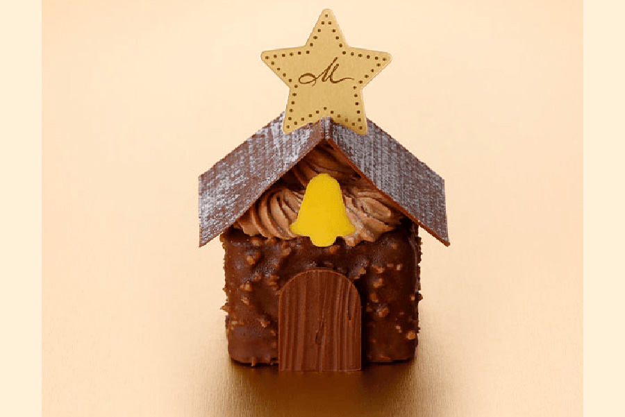 • 「マールブランシュ」の聖夜の雪降るおうち (864円)。なめらかなチョコレートクリームにふわふわチョコレートスポンジを重ね、まわりもチョコでコーティング