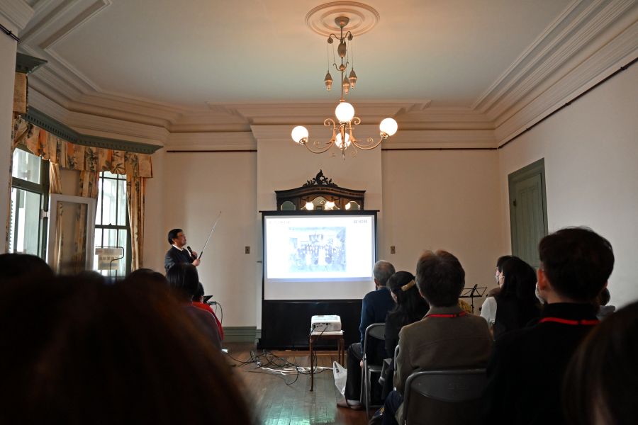 • ハンター氏とハンター住宅の歴史に、参加者たちは真剣に聞き入っていた(12月20日撮影)