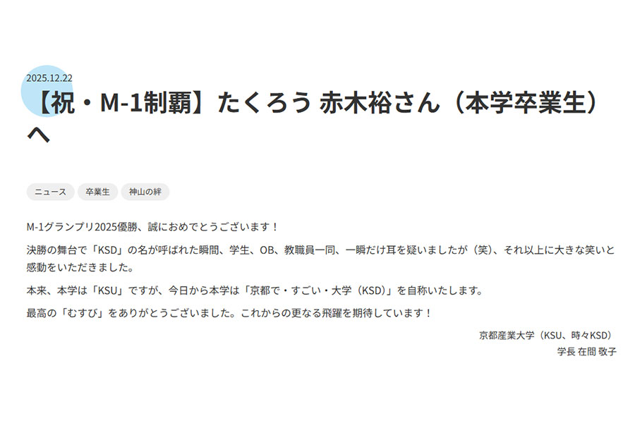 「敬意とお祝いの気持ちで…」たくろうの快挙に、KSD京都産業大学が粋な反応