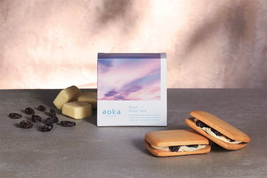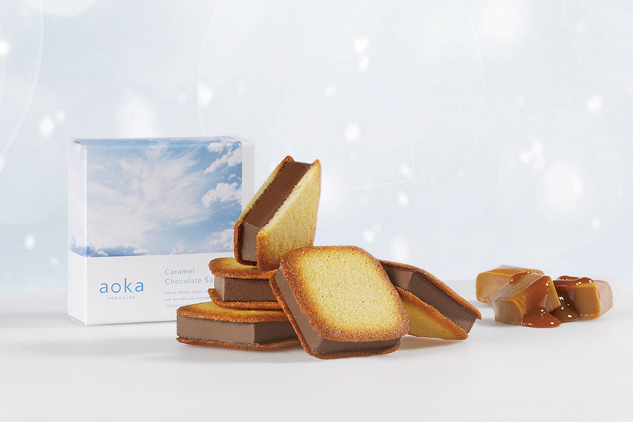 今回登場する「aoka」は2024年11月にデビューした北海道の新しい菓子ブランド。会場では、厚さ10mmのチョコレートを北海道産生キャラメルソースを練り込んだラングドシャでサンドした「キャラメルチョコレートサンド」(4個入1640円)をはじめ、ジャマイカ産のラムの⾹りを纏わせたレーズンを、バタークリームにからめ、やさしい⾷感のサブレでサンドした「レーズンバターサンド」(1個入411円)などが並ぶ。