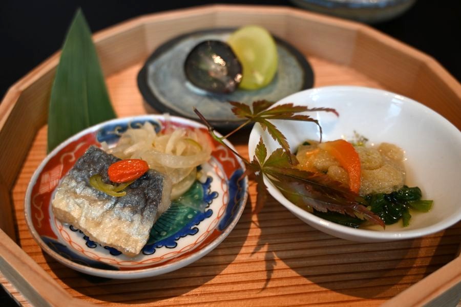 • コース料理の先付3点盛り(一例)イワシ南蛮漬け、空心菜おひたし、シャインマスカットなどの白和え