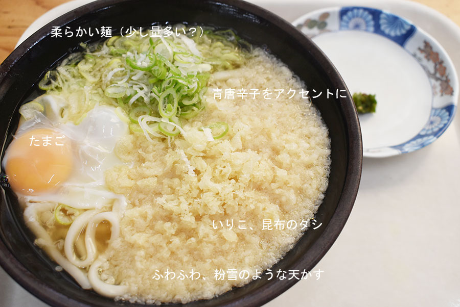 ここでは並うどんに玉子を落とした「玉子うどん」を注文。青ネギに天かす(同店では、宮崎では珍しく「天かす」と呼ぶ)がたっぷり乗って、やはり麺は柔らかい。
