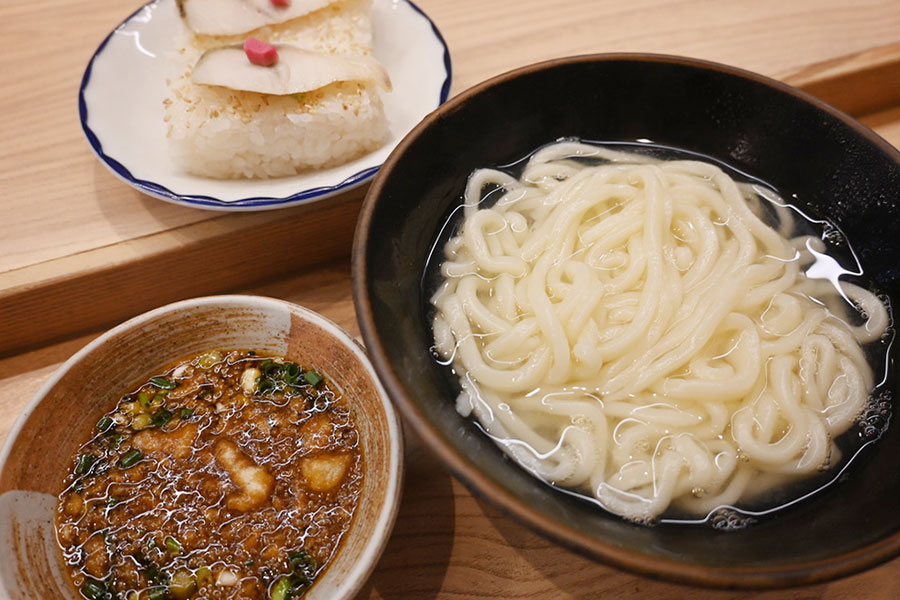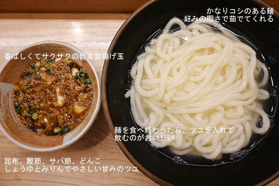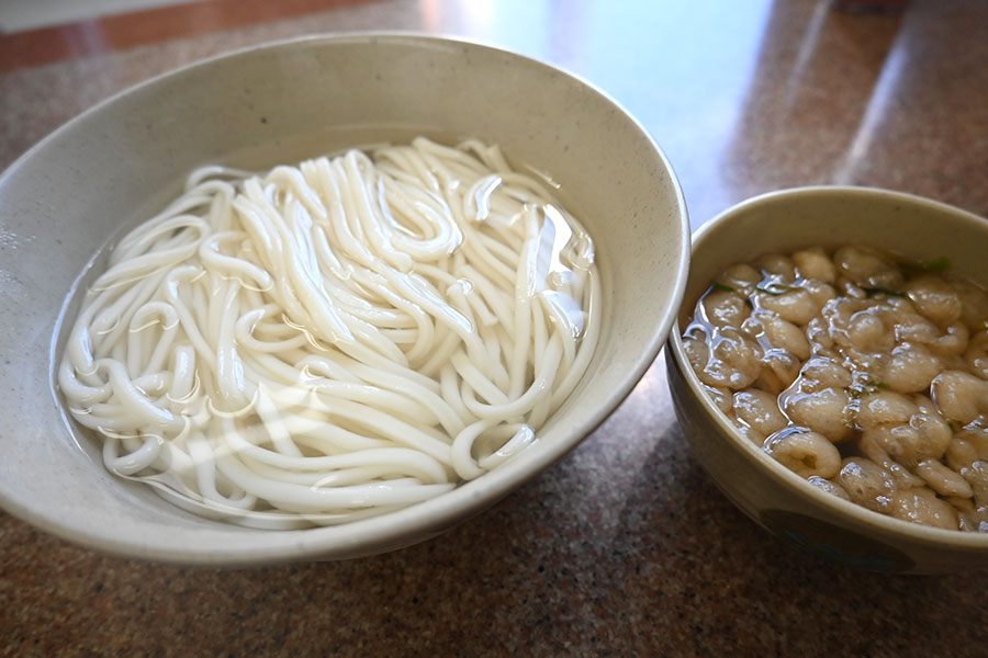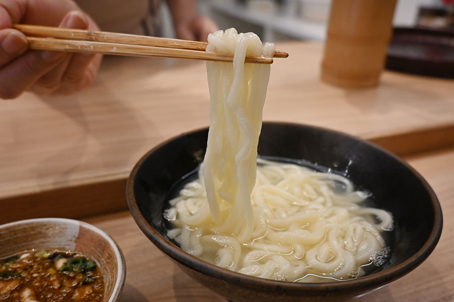 気になるうどんは、茹でた熱々のうどんをそのままダシにつけていただく「釜揚げうどん」タイプ。まず箸で持ち上げたとき、麺の細さに驚いた。これは早く茹で上がるように、そしてツユによく絡むようにという意味があるそう。