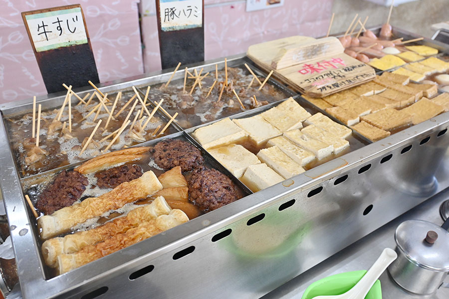 ここで目が惹かれたのは入口近くに置かれた「おでん」。2代目の田崎さんによれば宮崎でおでんを出すうどん店はそう珍しくないそうだ。ちなみにおでんのタネは豚ハラミやハンバーグ、おふくろなど個性的なものが多く選ぶのが楽しい。