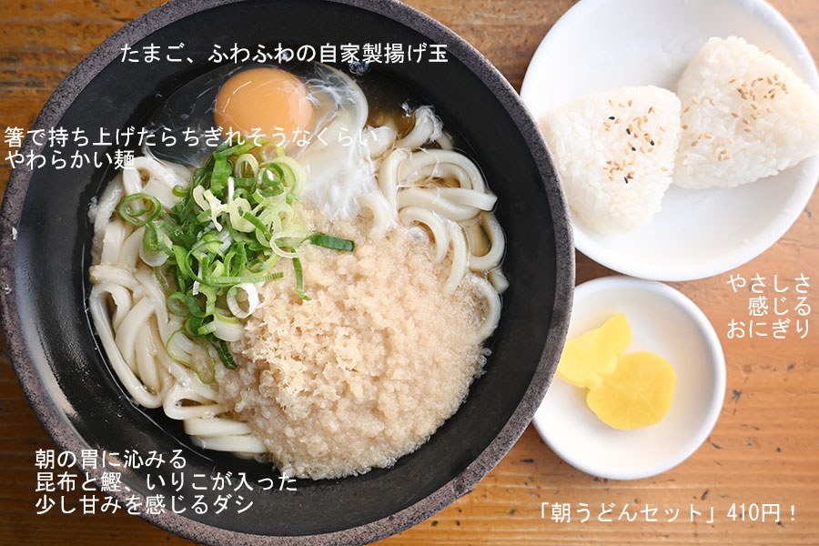 特筆すべきは「朝うどんセット」という朝限定のメニューだ。「たまご・わかめ・たぬき」の具材から好きなものを2つ選び、さらにおにぎり2個、もしくは卵かけご飯をつけられるというもの。これでしめて410円というから、物価高の昨今では驚異的なお安さだろう。