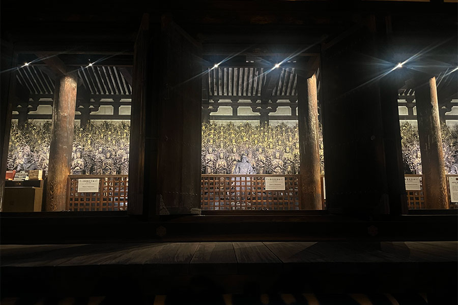 本堂東側の障子をすべて取り外し、南北約120mの本堂に安置された1001体の千手観音立像(国宝)や風神・雷神像などを庭園から拝観する——夜の闇に金箔の観音像が浮かび上がった。800年前には後白河法皇が見たとされる、まさに圧巻の光景だ。