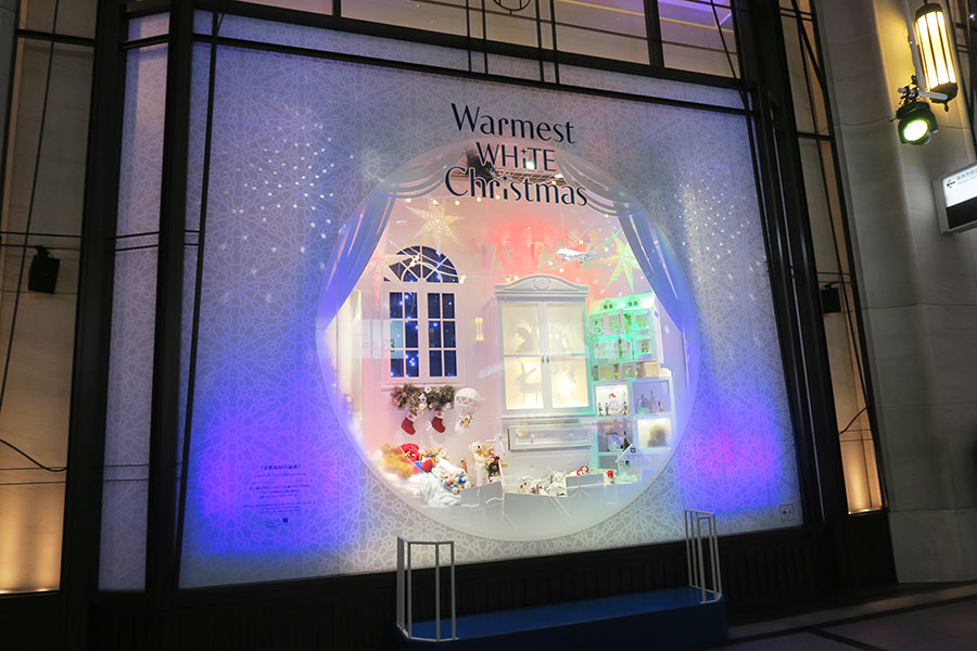 「阪急うめだ本店」の壁面に広がる同ウィンドーは、百貨店としては全国トップクラスの規模。横約6m×高さ約4mのウィンドーが7面並び、館内イベントと連動した迫力のある演出が名物だ。この冬は「温暖化で雪景色が見られる場所が減るなか、あたたかいホワイトクリスマスを届けたい」という想いから、“スノードーム”をテーマに掲げた。