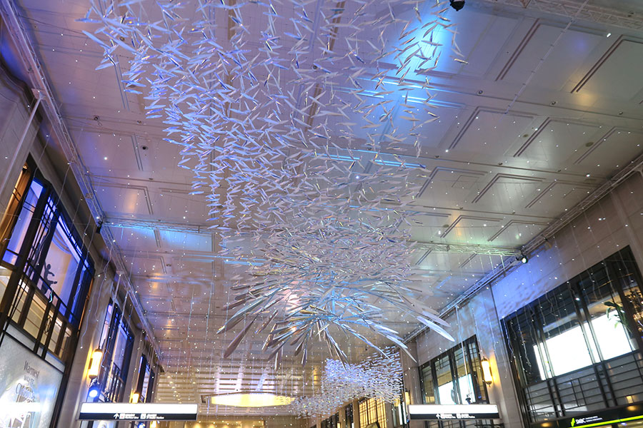 加えて今年は初の試みとして、「大阪梅田ツインタワーズ・ノース」1階コンコースのイルミネーションとコラボレーション。天井には約7000枚の羽根と大きな翼が連なり、光と音の演出と連動して輝きを放つ。落ち着いたホワイトからダイナミックなブルーまで、さまざまな光がコンコースを包み込み、幻想的な空間を作り出している。
