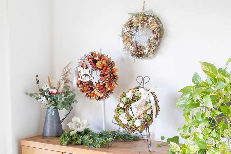 「お客様から『クリスマスリースを短期間で片付けてしまうのがもったいない。通年使えるものが欲しい』という要望がありましたので、オーナメントを簡単に取り外せるようにして、季節に応じて飾れるリースを提案しました。クリスマスリースは、オーナメントを外して秋冬シーズン用のリースになります」(山野井さん)