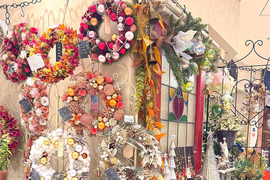 オフシーズンにも飾れるクリスマスリースの提案は今年が初めての試みだが、すでに順調に注文が入っているという。