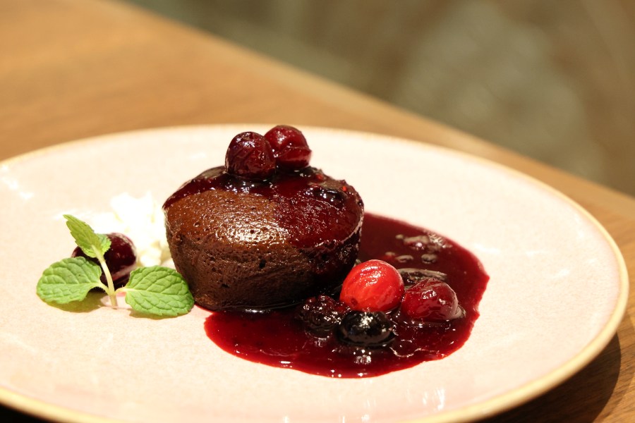• 「シェフ渾身のひと皿」の「フォンダンショコラ ベリーソース添え」ミントやホイップをお好みで添えるのもおすすめ