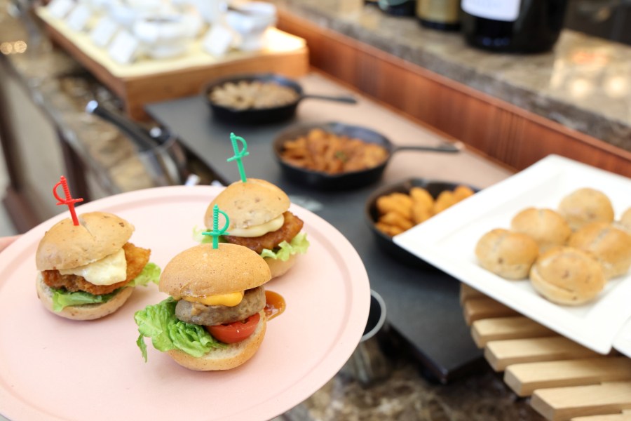 • ランチビュッフェ限定のカスタマイズ プティバーガー、ハンバーグや白身魚のフリットなど、好きな具材をサンドできる