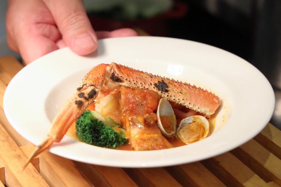 • オーダーが入ると目の前でカニをバーナーであぶり、出来たてを提供…「蟹と魚介類のブイヤベース風」