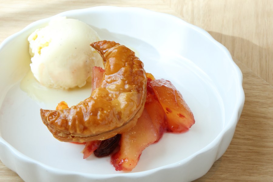 • 「シェフ渾身のひと皿」の「フルーツジュビレ バニラアイス添え」サクサク三日月パイもポイント