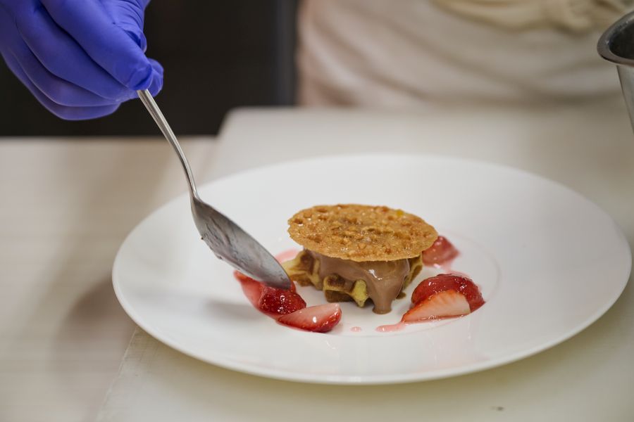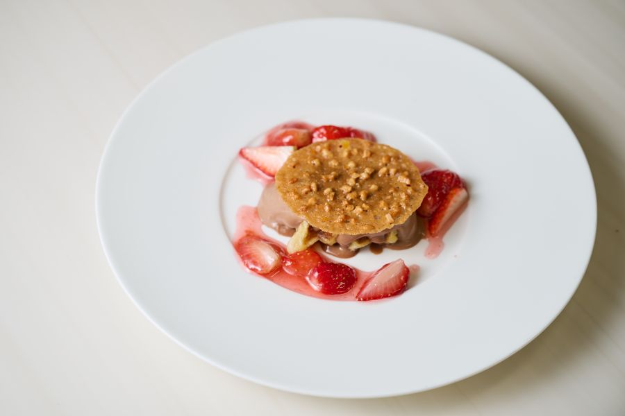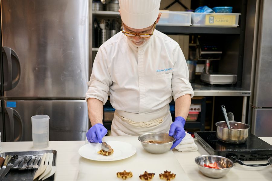 今回はそのうち、林シェフの「ゴーフルとクレームオショコラ いちごの温かいソース添え」の制作の様子を見学させていただきました。