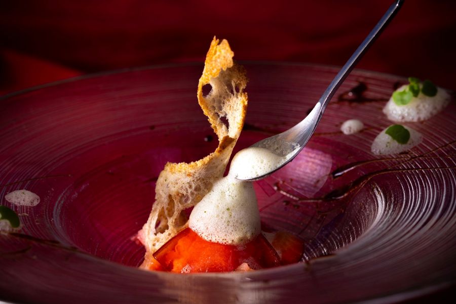 「神戸ポートピアホテル」芳養シェフが用意したのは「いちごのジュレとトマトのグラニテ 旨みと塩味のラスクとオリーブオイルでマリネしたいちご添え」。スイーツではありつつも、意外性のありすぎる昆布や干しシイタケで、奥行きを感じられる一皿に。ラスクは同ホテル製パン料理長の酒井シェフが協力し、ホテルの力を結集させた、とっておきのデザートに仕上がりました。
