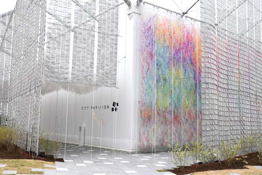 外側にはカラフルな布がゆらめく「NTTパビリオン」を設計したのは、「NTTファシリティーズ」の畠山文聡さん。「日本建築の縁側にあるような、待機列と展示が溶け合うような関係性ができないかと、分棟方式のパビリオンとしました」