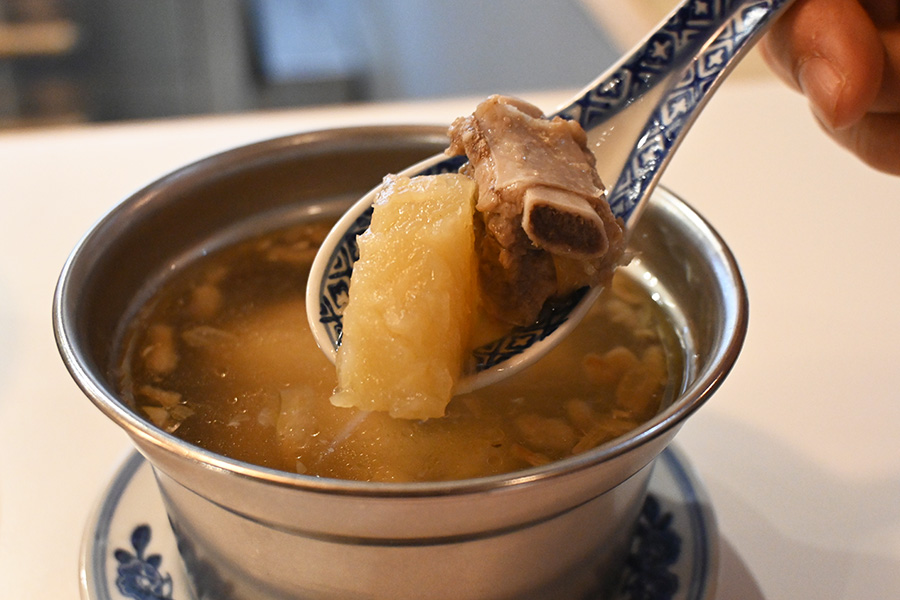 • 蒸湯・京地鶏、豚スペアリブ、発酵パイナップル(800円)。豆麹や砂糖を加えて発酵させた発酵パイナップルは、塩味があり、味噌っぽいフレーバーもふわり