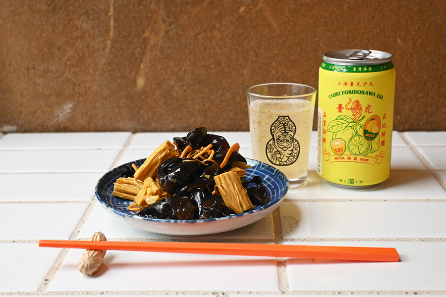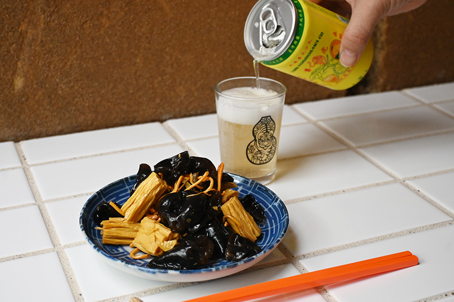 • 湯葉ときくらげ、サナギダケを青山椒入りのスープでゆでた「涼拌腐竹木耳」(湯葉ときくらげの和え物、650円)。台湾のブルワリー「タイフーブルーイング」のレモンフルーツエール(1100円)と一緒に