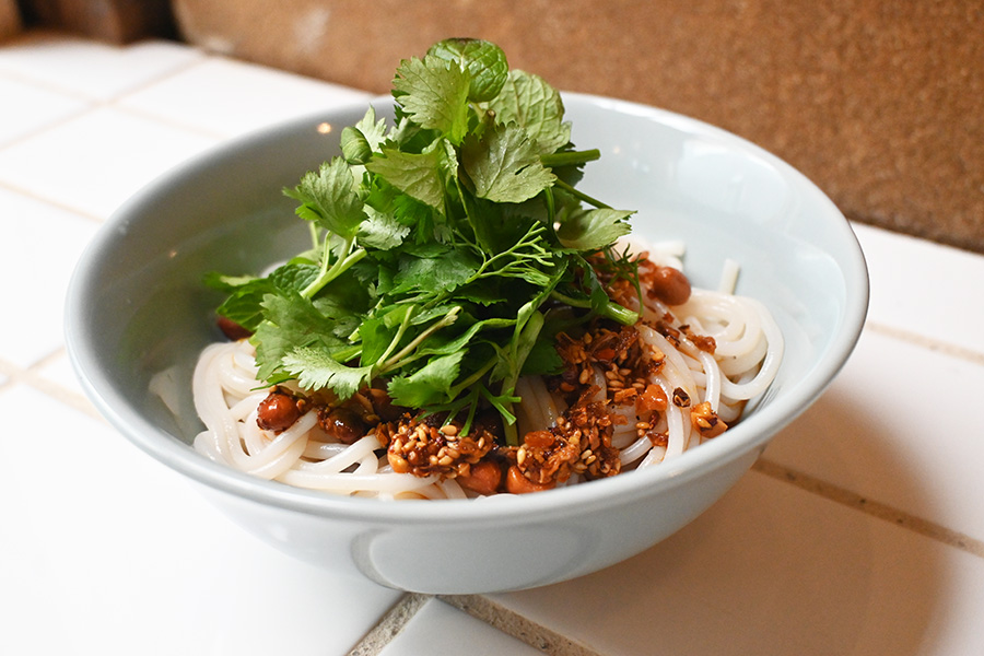 • 蒸湯に通常より小ポーションの「南昌拌粉」(麻辣和えビーフン、650円)をプラスすることも可能。麻辣醤を使用、発酵ささげと揚げピーナッツがアクセントに。「雲南ハーブ」トッピング(200円)