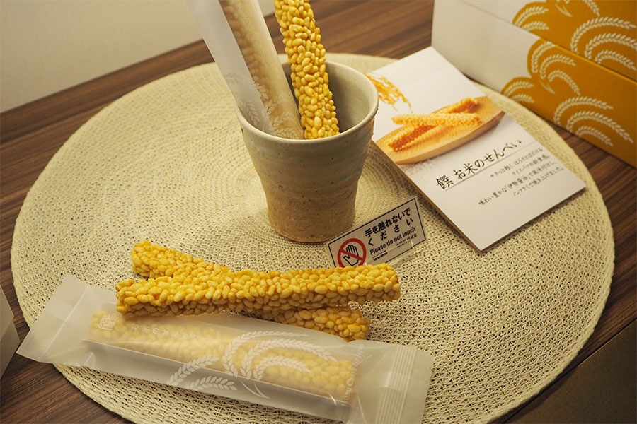 • 新商品の米菓「饌(せん)お米のせんべい」(5本・1000円)お米をパフにした軽い食感で、「伊勢醤油」の香ばしい風味が魅力