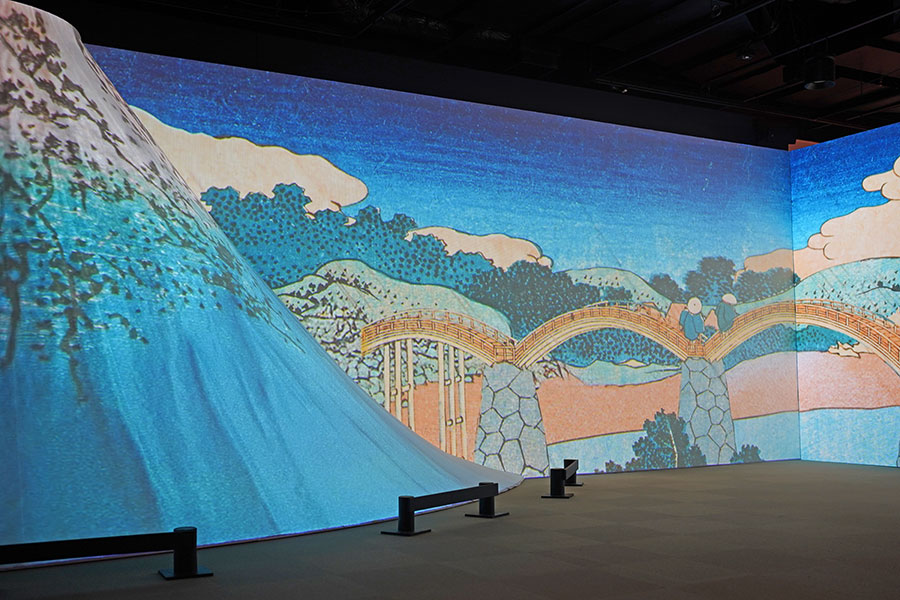 • 山型スクリーンを浮世絵と同じ画角に見えるよう使った、葛飾北斎『諸国名橋奇覧 すほうの国きんたいはし』(1月16日撮影/Lmaga.jp)