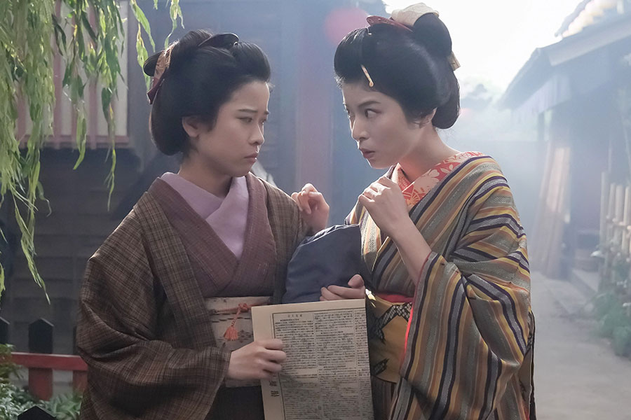 • 『ばけばけ』第77回より。「ヘブン先生日録」が掲載された新聞を読むトキの幼馴染み・サワ(円井わん)(C)NHK