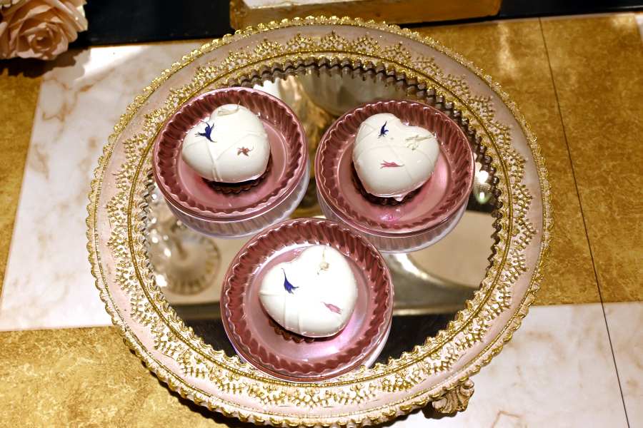 ウィーン伝統菓子のカーディナルシュニッテンをもとに、いちごと生クリームを特徴的な軽さのある生地で挟んだ「いちごのカーディナルシュニッテン」。同じくオーストリアやドイツで愛されるクランツをいちごでアレンジした「王妃のクラウン」もスタンバイ。「紫のジュエリー」の中身は濃厚なチョコレートと食べてみてのお楽しみフルーツが組み合わされている。