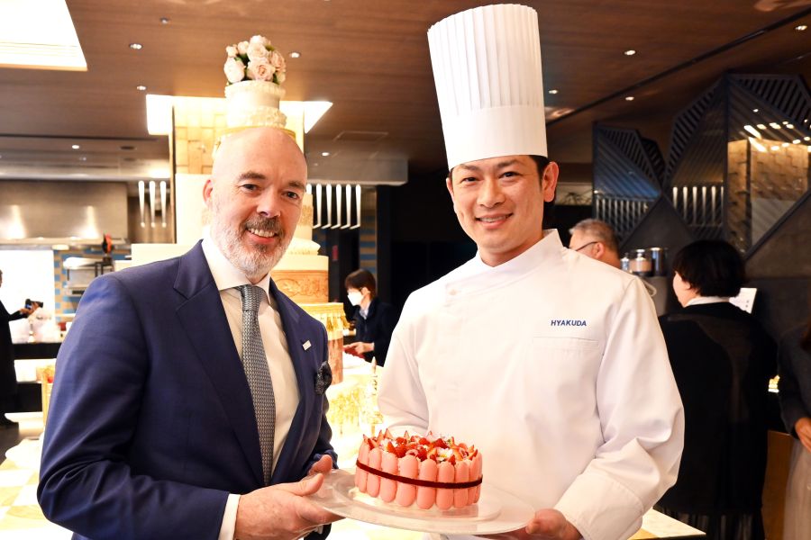 エグゼグティブ・ペストリーシェフの百田利治さんは、「いちごがメインではあるものの、シーズンをまたぐ5月末までのビュッフェなので、赤紫蘇とチーズを合わせたり、さまざまな味を調整しながら飽きがこないように考えました。ベースになっているいちごクリームやソースも、いちごだけではなくて、ブルーベリーやヨーグルトと合わせたり、さまざまな工夫をしていまして、こだわりというよりちょっとマニアックかも。」と笑顔で話した。