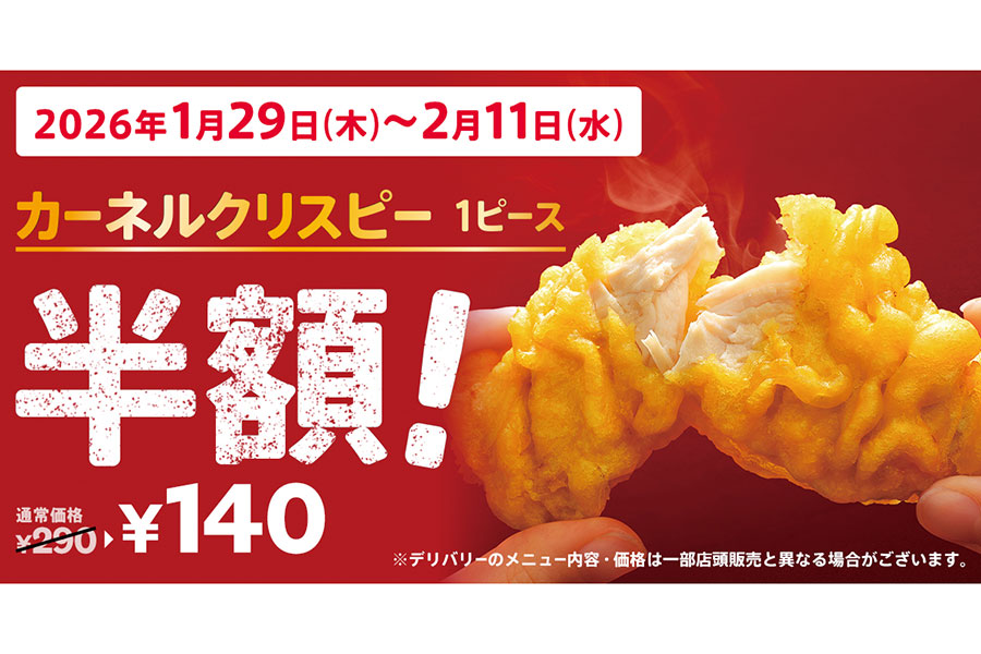 ファストフードチェーン「ケンタッキーフライドチキン」(代表:遠藤久)は、人気サイドメニュー「カーネルクリスピー」の半額企画を実施。1月29日よりスタートする。 やわらかい鶏胸...